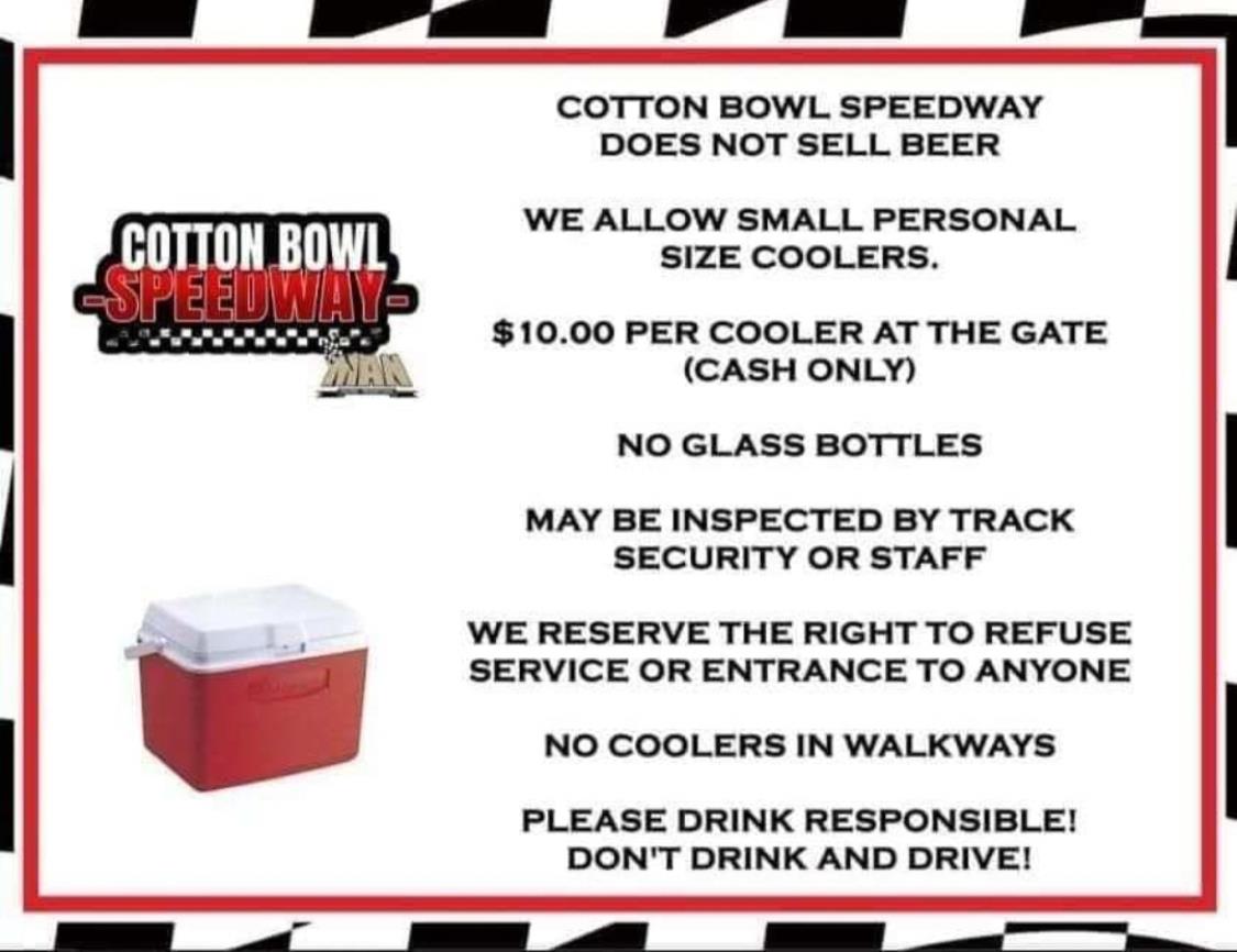 Track does NOT sell alcohol (see personal size cooler policy) $10 cash only at Front Gate - Grandstands ONLY!